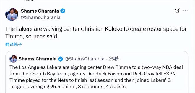 北京时间11月25日,据名记Shams报道,经纪人费森和格雷向ESPN透露,洛杉矶湖人队将从其发展联盟附属球队南湾湖人队签下中锋德鲁-蒂米,双方达成一份双向合同。蒂米上赛季末期效力于布鲁克林篮网队,随后加入湖人队发展联盟球队,在G联赛场均贡献25.5分、8个篮板和4次助攻。为了给蒂米腾出阵容名额,湖人裁掉了中锋科洛科。